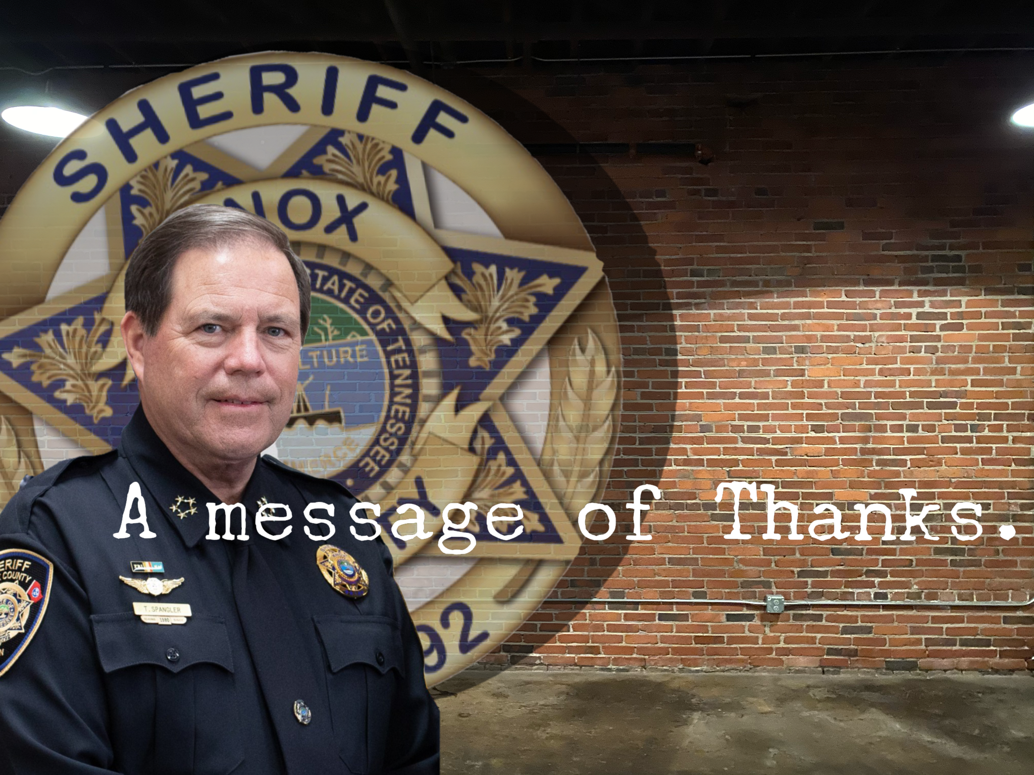 Sheriff Spangler with KCSO badge background and "A Message of Thanks"