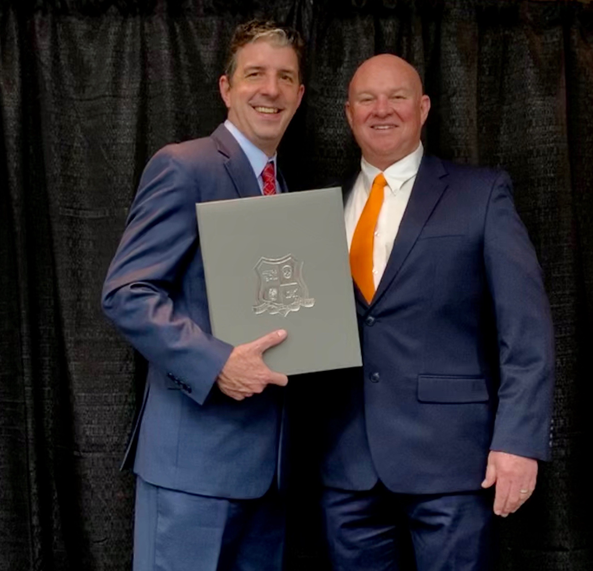 Mullinax in suit posing with anothe rman in suit holding award