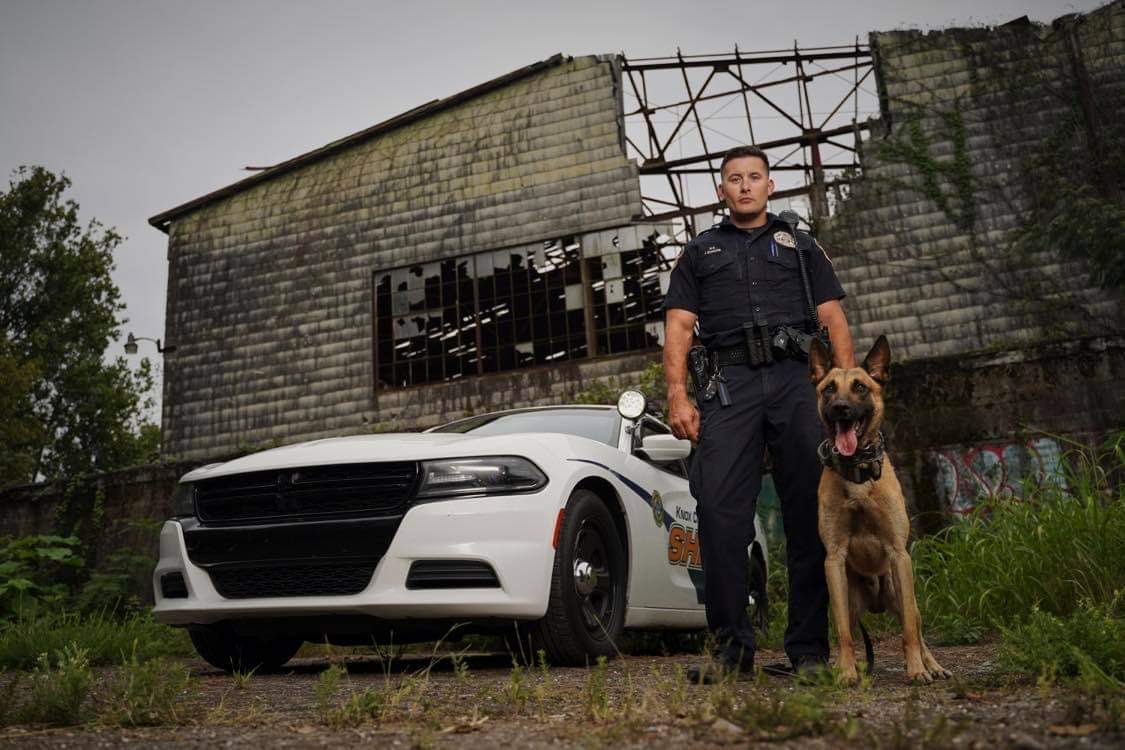 Officer and K9 standing next to cruiser